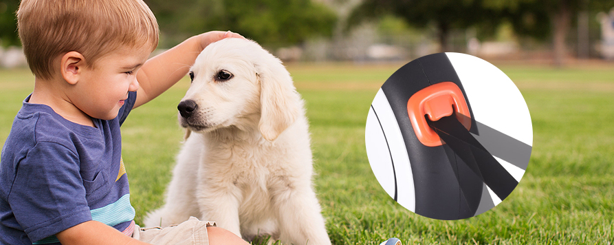 Der Ein-Knopf-Verriegelungsmechanismus ist elegant und praktisch. Durch einfaches Drücken verriegelt sich die Leine sicher und verhindert so, dass Ihr Haustier vorwärts rennt oder nach hinten zieht. Der Knopf ist leichtgängig und empfindlich, so dass er weder blockiert noch klemmt, und das Design des nach unten gerichteten Auslösers macht die Bedienung einfach und schnell.